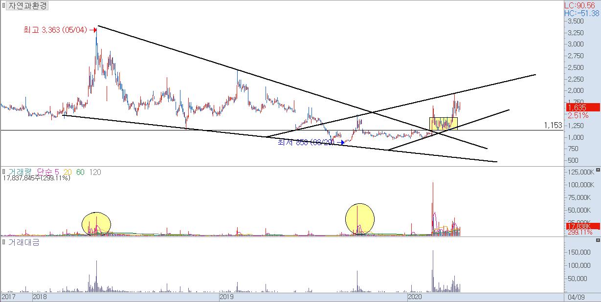 자연과환경은 하락형 쐐기형 패턴에 기준가에서 저항이 나와주고 있는데..