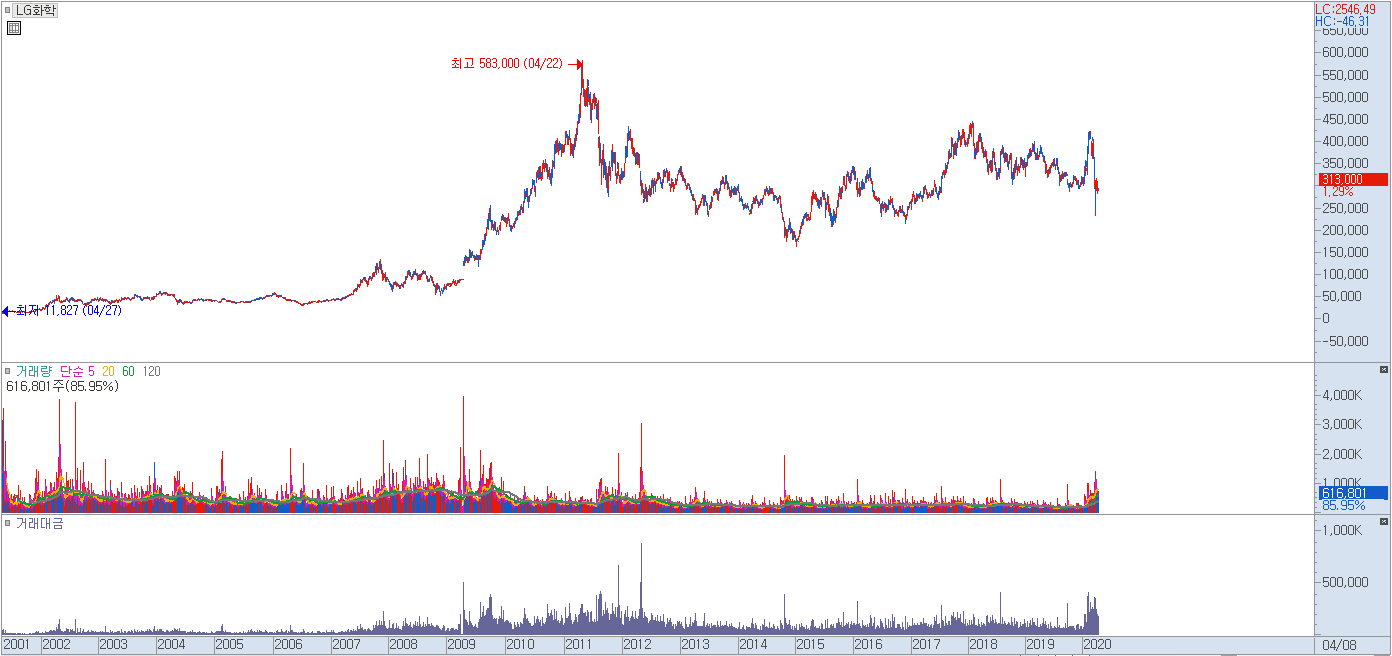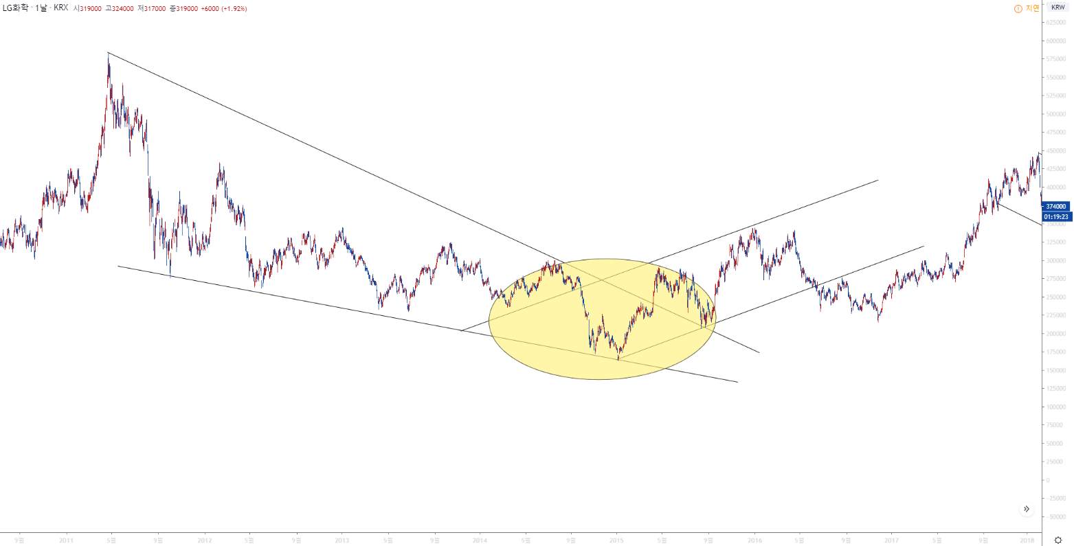LG 화학차트를 예시로 들어보면 2011년부터 2015년까지 하락쐐기형 패턴이 만들어지면서 하락추세가 만들어진다.