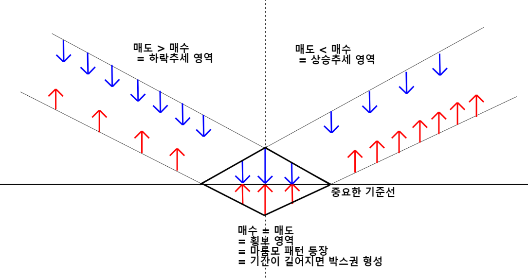 마름모 구간에서는 매수 = 매도 가 팽팽하게 맞서는 영역이 발생을 한다.