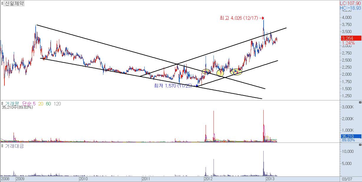 삼성제약은 추세, 특히 마름모 패턴에 있어서 좋은 차트이다.