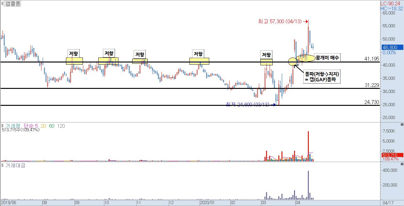 앱클론은 약 41,200원 구간을 19년도 6월부터하여 2020년 2월까지 오랜 시간동안 저항을 받으며 돌파를 못했던 종목이었다. 그러다가, 이번 항체 치료 관련 이슈로 5번의 도전에도 돌파하지 못했던 저항구간을 갭(Gap) 으로 돌파했다.