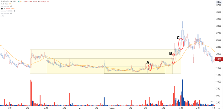 A,B,C 구간에서 크고작은 박스권 돌파를 보여주는 거래량 실린 양봉이 출현을 하는데..