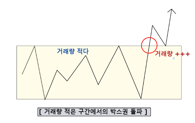 점수가 높은 박스권 돌파는, 박스 구간내의 거래량보다 훨씬 많은 거래량 또는 거래대금이 터져주면서 상방돌파가 나와주는 경우이다.