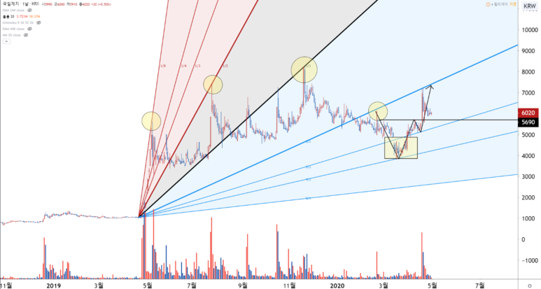 결국 약세 국면 진입 이후에 코로나19 사태까지 겹치면서 급락을 하였지만, 8/1 지점에서 반등이 나와준 것을 확인해볼 수 있고, 국일 제지와 같이 중요했던 2/1 지점을 강한 기준봉으로 재돌파 해주면서 현재 박스권을 형성해주고 있는 흐름이다.