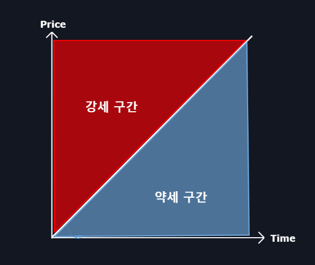 이러한 1:1대응선을 기준으로 주가(가격)이 45도선 위에 있으면 강세구간, 45도 아래 있으면 약세구간이라고 판단하였다. 그러므로 45도의 추세선이 붕괴되거나 돌파되면 기존의 추세와 정반대로 추세가 진행이 된다.