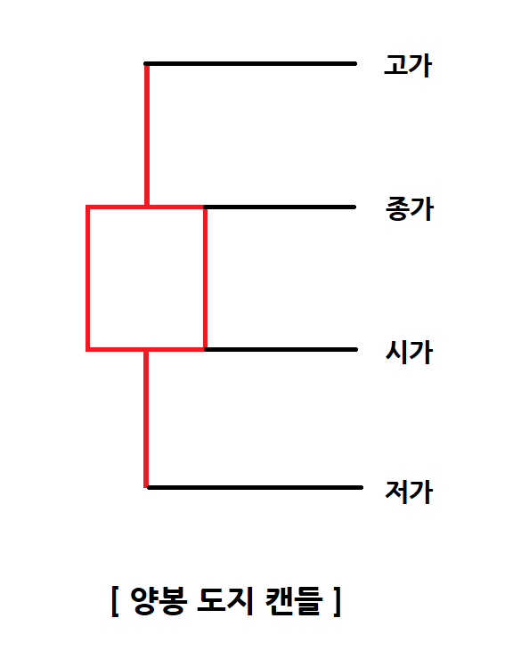 일단 기본적인 양봉도지 캔틀은 위와 같은 모양이며, 이러한 양봉도지 캔들은 좀 더 세세하게 나누면 약 3가지로 분류를 할 수 있다.