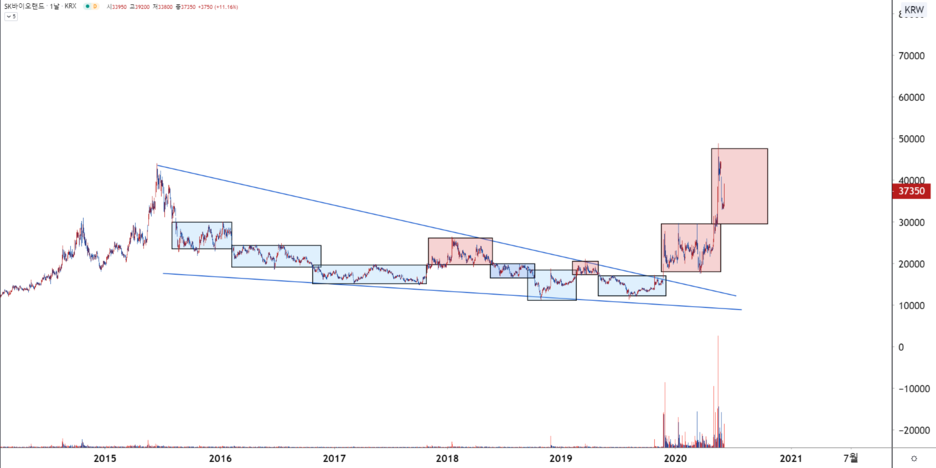 박스권 상단선 또는 하단선 을 돌파한다는 것 자체가 '주가'가 상/하 방으로 추세를 형성한다는 의미이기 때문이다.
