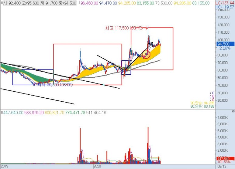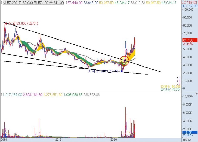 옵티팜의 경우는 2019년 동안 지속적인 하락추세에 있다가, 최근 2020년 5월에 거래량이 터져주며 20일선과 60일선이 골든 크로스, 즉 (빨간박스)상승국면에 진입을 했다고 볼 수가 있다.