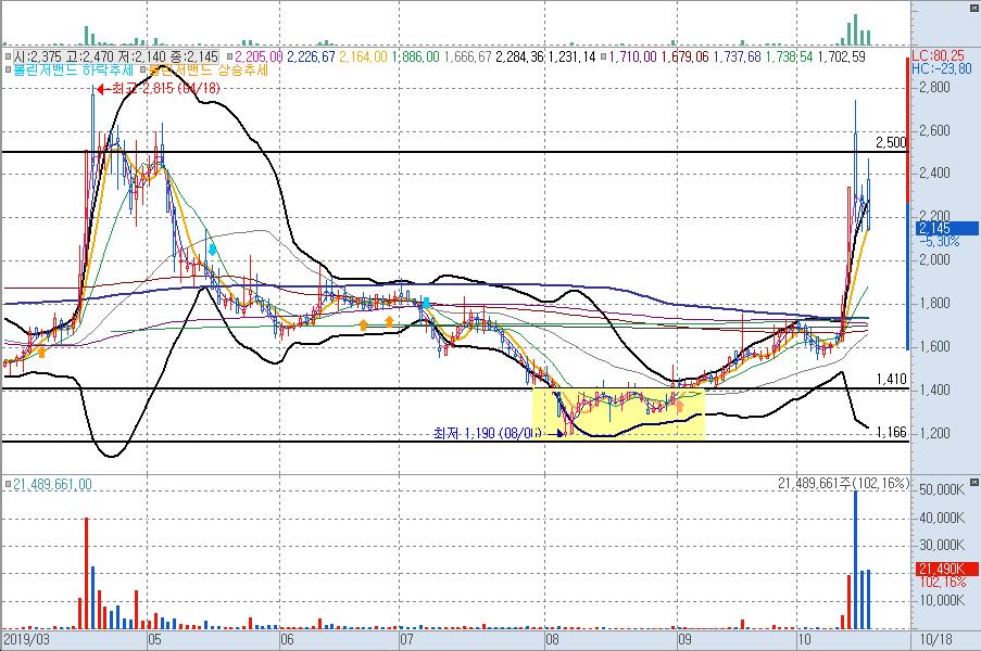 - 이후 볼린저 밴드 상승 추세 신호 뜨고 단기적인 시세가 나왔습니다.