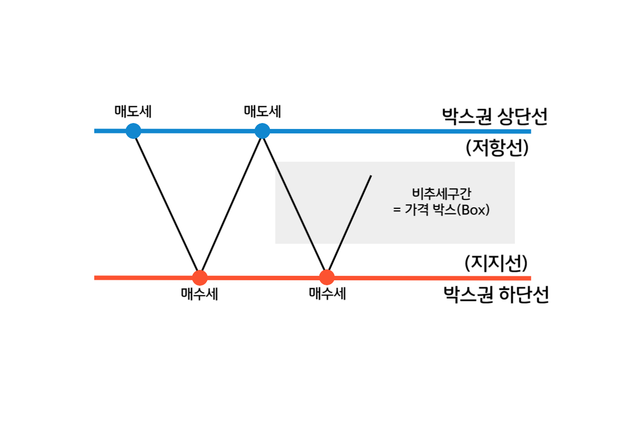 박스(Box)는 횡보 구간이라고도 하며, 추세의 의미에서 ‘비추세 구간’을 의미합니다.