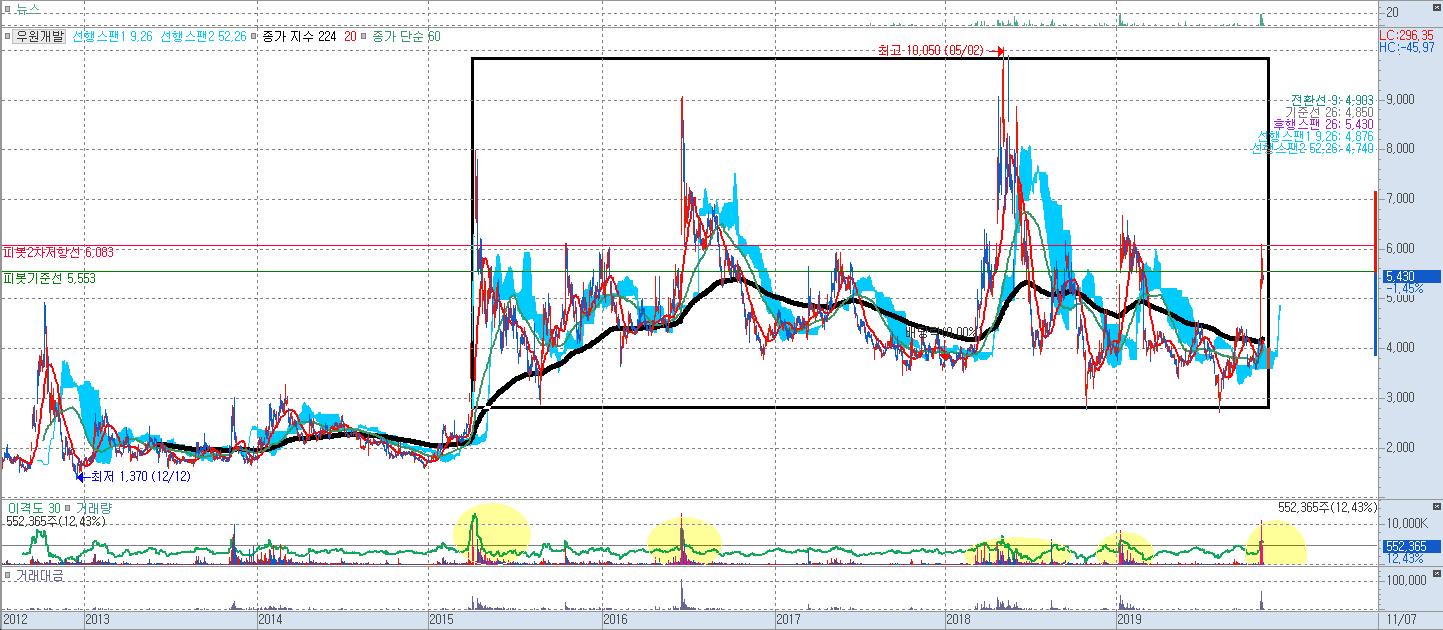 우원개발은 최근 몇년동안 정말 변동성이 최고의 주식이었던것 같습니다.