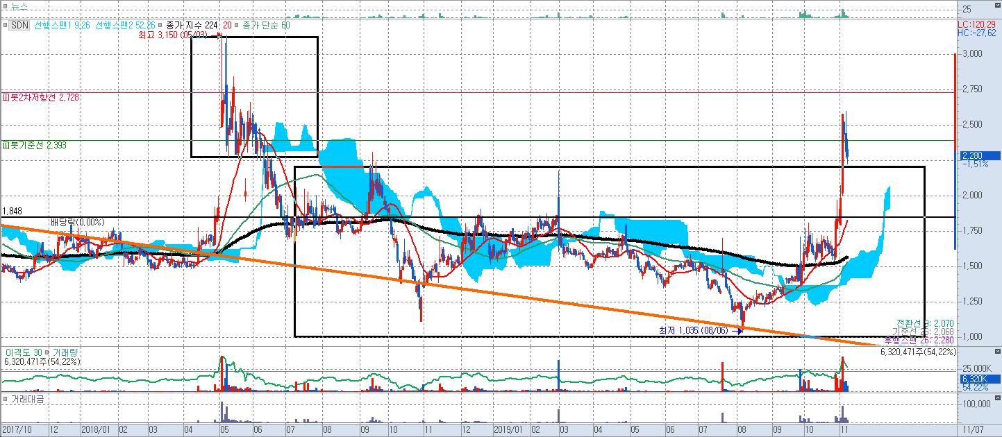 하지만 저라면 새로운 박스권에서 조금 조정을 받을 때 분할매수로써 SDN 과 마찬가지로 모아가는 매매를 해야하는 종목이라고 생각합니다. SDN 과 마찬가지로 골파기가 나올 가능성이 높기 때문이지요.