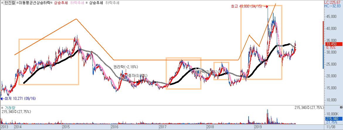 2019년 초에 대시세가 한번 나왔던 한진칼 차트입니다.