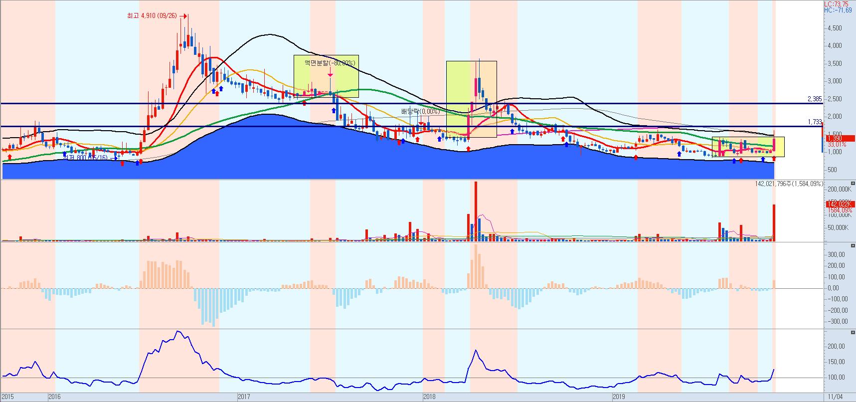 액면분할이후 주가는 계속하락세를 보이다가 , 2018년도 3월달에 큰 시세가 한 번 나왔었네요.