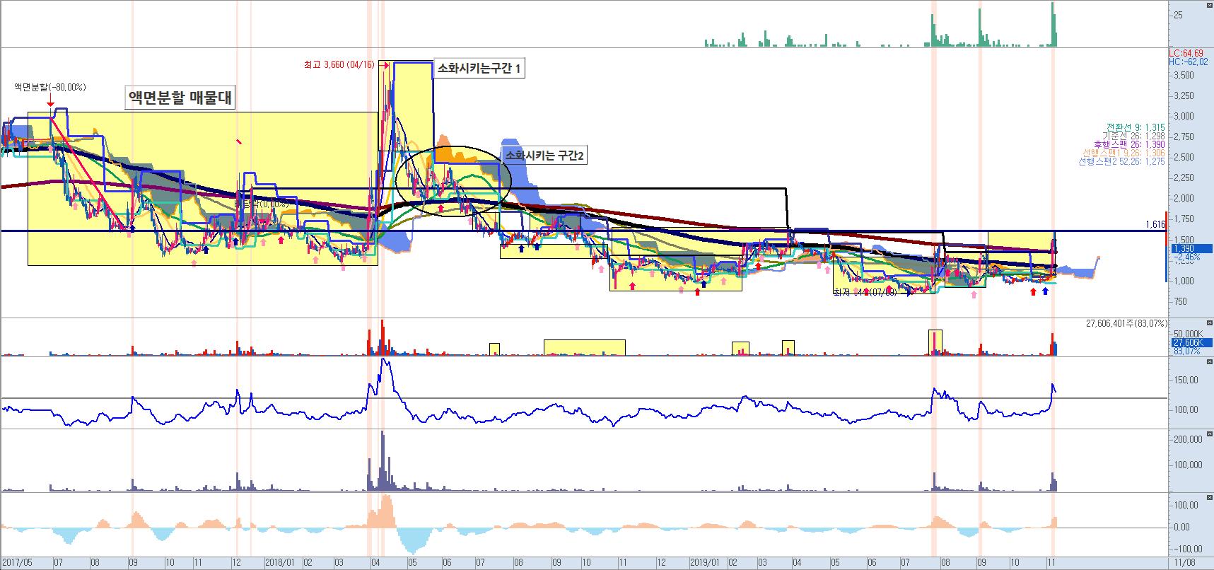 소화시키는 구간 1에서는 액면분할대의 매물대에 시세를 한번주고,