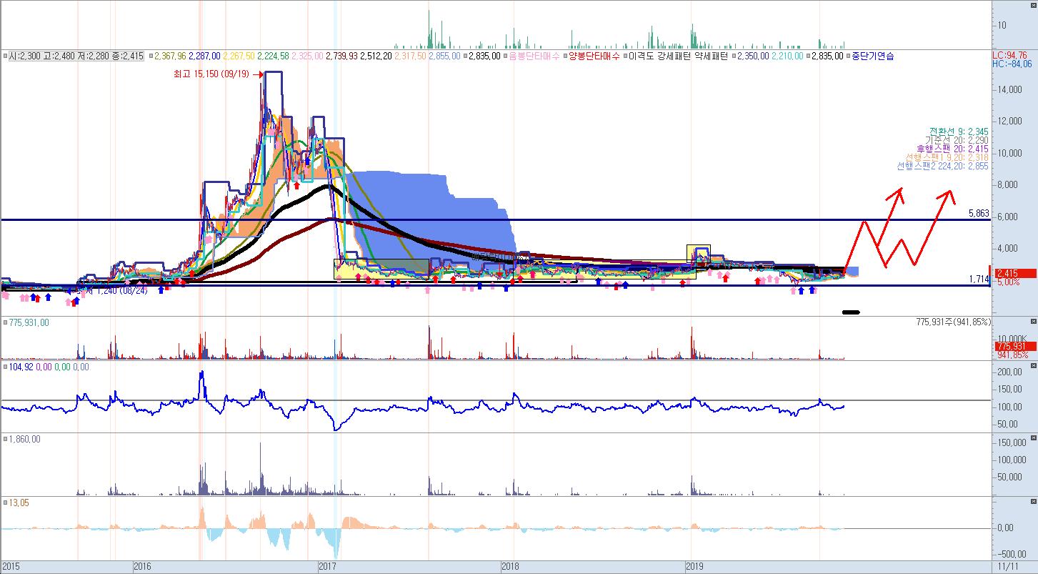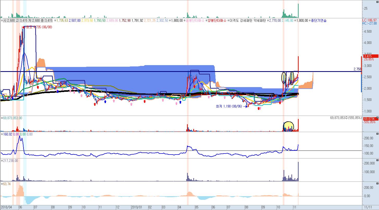 아직까지 정확환 상승초입을 보여주는 단계는 아니라서 지켜만 보고 있습니다. 2500~2700원 정도오면 1차매수 타점을 잡아볼만 할 거같네요.