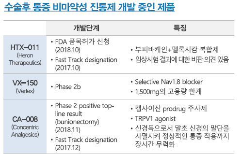이러한 미국의 사회적 영향 때문에 비마약성진통제인 오피란제린(VVZ-149)이 더욱 기대감을 형성시키고 있습니다.