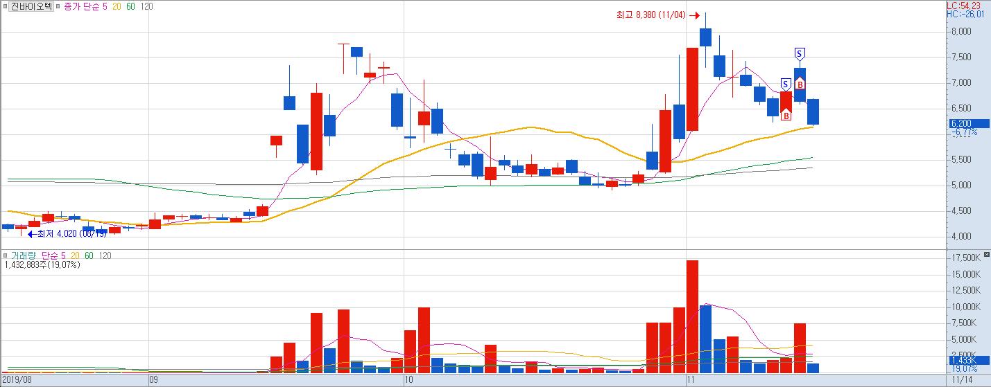 일단 다행이 이번 진바이오텍도 가격대를 지켜주며 종가에 4.36 % 수익매도를 하였습니다.