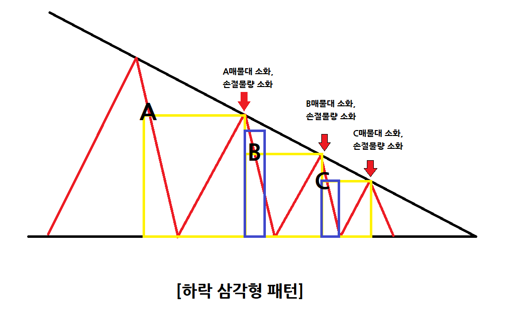 그렇다면 왜 하락삼각형이 하락할 가능성이 높은 패턴인가에 대해서 개인적으로 연구해보겠습니다.
