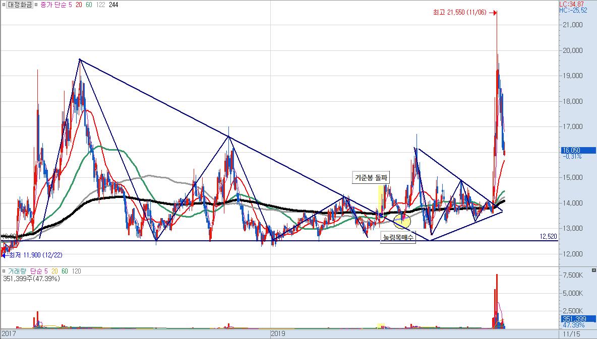 대정화금의 경우도 작년과 올해 초까지 계속해서 고점을 낮추면서 하락삼각형 패턴으로 만들었다가