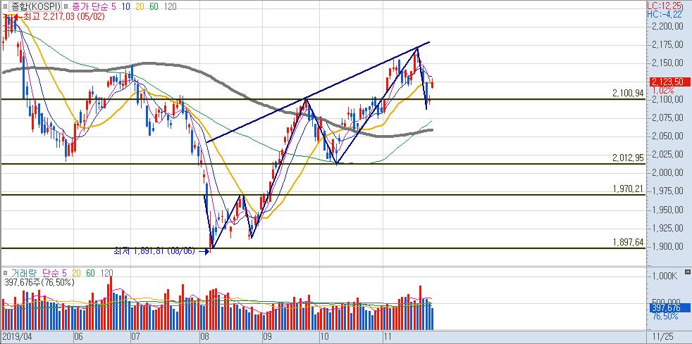 지소미아 관련 이슈도 어느정도 진전이 되고, 미국의 홍콩 시위 관련하여 중립적인 태도를 비추면서 더 이상 악화되지않는 상황에서 투자심리가 오늘 어느정도 회복된 모양새이네요.