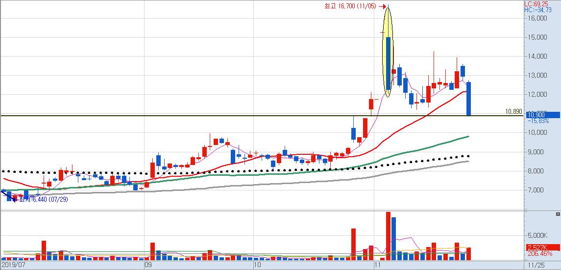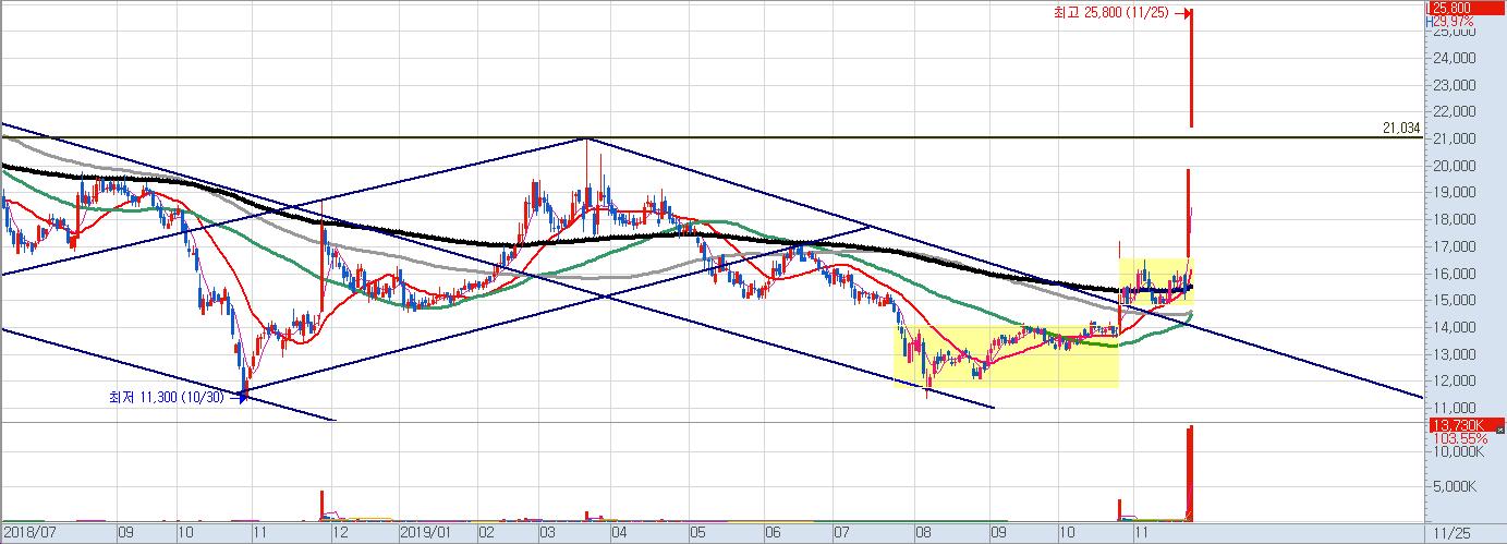 상승 추세가 계속해서 지속 되면서, 11월 25일 갭상승으로 출발하여 강한 양봉으로 전일 고점인 15,000원을 돌파해줍니다. 이후 가격이 너무지지 않고, 중간중간 거래량이 조금 꾸준히 터져주면서 20선을 지지 받고 상한가로 말아올려버리는 아주 착한 세력의 정직한 차트였습니다.