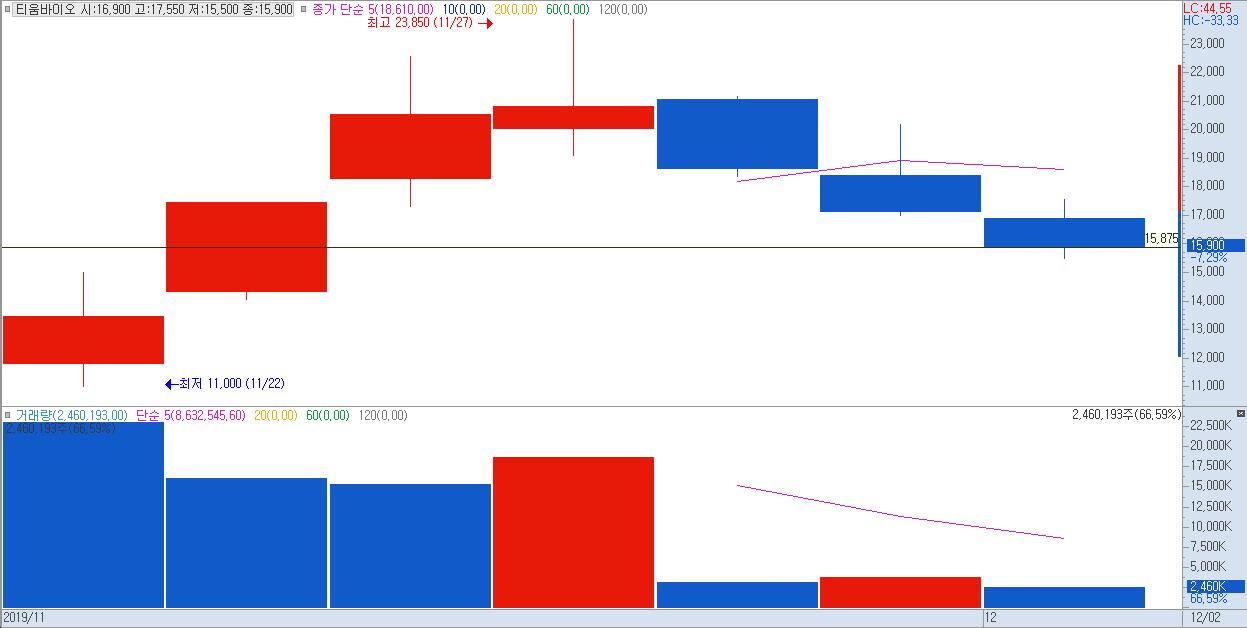 신규상장주로써 강한 흐름을 보였던 티움바이오도 하락세가 나옵니다.