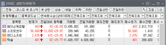 상한가는 오늘 여전히 관리종목과 동전주들인 개잡주에서 수급이 들어왔습니다.