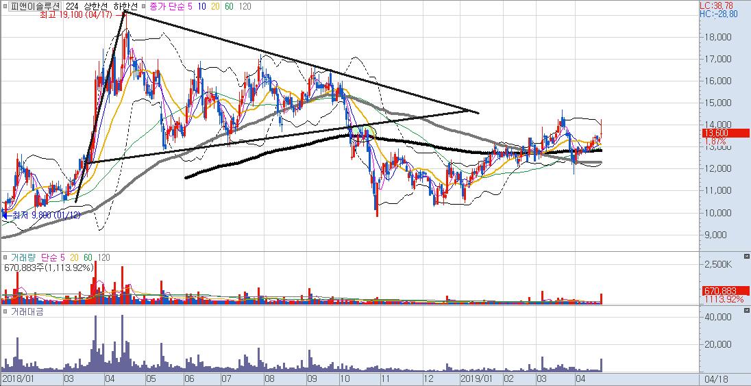 국일신동은 2019년 1월 부터 엄청난 상승파도이 발생하며 고점에서 대칭삼각형 패턴을 만들며 수렴하였다가,