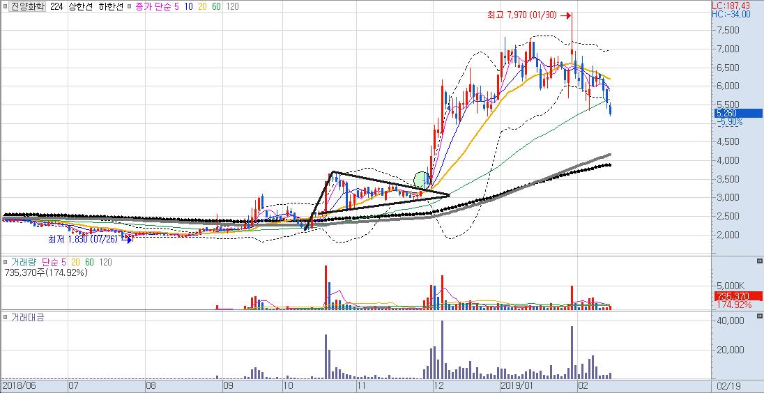 2018년 10월~11월까지 대칭삼각형 패턴이 만들어지다가, 상단선을 돌파해주면서 매집음봉이 나옵니다.